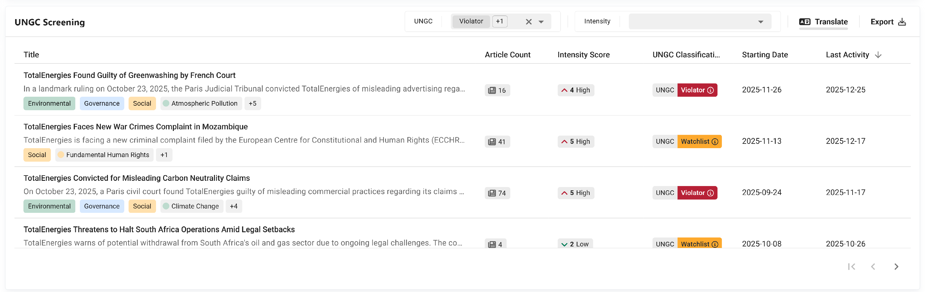 We're pleased to announce the rollout of a new capability in the Case Monitoring dashboard: UNGC Violation Screening. This new capability automatically flags ESG controversies potentially breaching the United Nations Global Compact (UNGC) Principles.